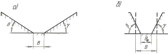 Для определения параметров ударной волны можно воспользоваться рекомендациями §4.9. Если угол падения фронта на склон α = При α < α пред _имеет место регулярное отражение. Давление в отражённой волне рассчитывается по формуле Измайлова (4.90). Импульс давления в фазе сжатия отраженной (при α < αпред) и головной (при α > α пред) волн определяют по аналогии с расчетом импульса соответствующих волн в зонах регулярного и нерегулярного отражения при воздушном взрыве над поверхностью земли, см §5.1. При затекании ударной волны на тыльный («теневой») склон, рис.42б, максимальное давление в волне затекания ΔРзат при значениях давления в проходящей волне ΔРф < 50 кПа находится по соотношению ΔРзат = Давление затекания ΔРза т при ΔРф >50 кПа, можно определить, опираясь на рекомендации [16]. Продолжительность фазы сжатия волны затекания приближённо принимают такой же, как в проходящей волне. Импульс давления в фазе сжатия волны определяют по соотношению (5.4) при замене величины ΔРф на ΔРзат (при этом значение Рассмотрим взрыв, происходящий на дне ущелья треугольной формы, склоны которого наклонены под углом β и γ к горизонту, рис.43.а.