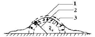 Рис.46. Схема взрыва облака газовоздушной смеси 1-граница облака ГВС, 2- средний радиус облака, 3- фронт детонационной волны