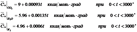 Среднюю теплоемкость полученных в ходе реакции взрывчатого превращения продуктов взрыва можно оценить по приближенным соотношениям (2.24) Подсчитаем теплоемкости продуктов взрыва: 3 CO2 3·(9 + 0.00093t) = 27 + 0.00279t 4 H2O 4·(5.96 + 0.00135t) = 23.84 + 0.0054t 18.8 N 2 18.8·(4.96 + 0.0006 t) = 93.25 + 0.01128 t Всех продуктов 144.1 + 0.01947 t Теплота взрыва пропана Qv = 46.4 МДж/кг = 2042 кДж/моль = 487·103 кал/моль. Получаем уравнение: