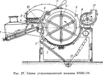 20. Угарами называют отходы, получаемые в результате производства пряжи и ткани из нее. Угары, используемые вновь после соответствующей обработки в смесях для выработки ткани данного артикула, называют обратами.Угары суконного производства. К угарам суконного произ^ водства относятся ровничный лом, крутые концы, очес и сдир аппаратный, угары отделочного производства. Кроме того, в суконном производстве широко используют угары гребенного прядения: гребенной очес, аппаратные выпады, концы пряжи. Благодаря использованию угаров уменьшаются потери сырья, повышается выход готовых тканей из сырья и, следовательно, снижается себестоимось готовых тканей. Ровничный лом и мычка с прядильных машин представляют собой обрывки ровничных нитей, получаемых в аппаратном и прядильном отделах. Это наиболее ценный вид обратов производства. Он состоит из равномерно распределенных и очищенных волокон. Ровничный лом разделяется по партиям смесей и после разрыхления на щипальной машине вводится в однотипные смеси. Крутые концы, или обрывки пряжи, получаются в прядильном и ткацком отделах в виде отходов. Волокнистый материал, полученный в результате разработки концов пряжи, является ценным сырьем.Концы пряжи разделяют на чистошерстяные и полушерстяные, грубые аппаратные и грубые гребенные, полугрубые аппаратные и полугрубые гребенные, мягкие аппаратные и мягкие гребенные. Такое разделение дает возможность выбрать лучший способ разработки концов и наиболее выгодно использовать их как прядильный материал.Концы пряжи разрабатывают на волокна на комбинированных концервальных машинах, а иногда на волчках — машинах, применяемых для разработки лоскута. Очес аппаратный представляет собой угары, получаемые при чесании смеси на чесальном аппарате. Очес состоит из некоторого количества тонких и грубых коротких волокон, сухих и мертвых волокон и большого количества сорных примесей в виде, перхоти, растительных и землистых примесей. В состав чесального аппарата обычно входят две или три чесальные машины. Очес, получаемый на первой машине, значительно грубее и более засорен, чем на второй; наиболее мягкий и чистый очес получается на третьей машине. Поэтому для наиболее выгодного использования очеса его собирают отдельно по машинам, отдельно собирают также пух, который скапливается по краям рабочих органов машиныДля очистки очеса и сдира применяется угароочищающая машина (рис. 27). Аппаратныйсдир представляет собой угары в виде сильно загрязненных, пропитанных жиром волокон, которые снимают с рабочих органов чесальной машины во время чистки.Сдир содержит от 25 до 50% полноденных волокон, 30— 50% землистых и растительных примесей и 10—20% жира. Грязь, жировые вещества и волокна сильно перемешаны между собой, и поэтому очистка волокна сдира затруднительна. Сдир сначала обрабатывают на угароочищающей машине, при этом