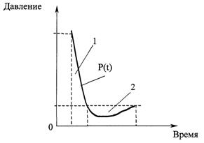 1 – положительная фаза; 2 – отрицательная фаза (волна разрежения) Рисунок 2 – Структура идеальной взрывной волны На основании исследований, можно отметить следующие основные свойства ударных волн, которые необходимо учитывать при определении нагрузок, действующих на конструкцию при прохождении воздушной ударной волны: – скорость распространения ударных волн всегда больше скорости звука в невозмущенной среде; – на фронте ударной волны параметры состояния и движения среды изменяются скачком; – ударные волны сопровождаются перемещением среды в направлении распространения фронта возмущения; – скорость ударной волны зависит от ее интенсивности; – ударная волна не имеет периодического характера, а распространяется в виде одиночного скачка уплотнения; – при встрече проходящей волны с объектом ограниченных размеров происходит отражение и дифракция ударных волн; – при прохождении воздушной взрывной волны в грунте образуются ударные волны, которые взаимодействуют с объектом. При решении конкретных прикладных задач к основным параметрам, характеризующим разрушающую способность взрывной волны, относят избыточное давление (Δр), которое представляет собой разность между максимальным давлением взрыва и начальным давлением среды и удельный импульс взрыва (i). Законы изменения нагрузок во времени, при решении прикладных задач, заменяют упрощенными – расчетными. Известно, что давление в волне – есть функция скорости выделения энергии при сгорании объема газовой смеси, а импульс волны – слабая функция скорости тепловыделения.