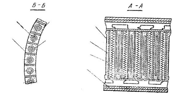 Рисунок Б2 Вертикальный разрез стенки барабана в радиальной плоскости: а) — по щели, б) — по нагревательному элементу.