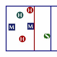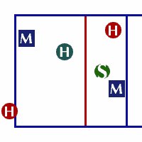 На задней линии диагональный игрок находится ближе с сетке и после подачи он также меняется позициями с Центральным блокирующим второй линии.