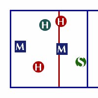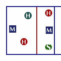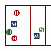 Здесь диагональный встает между центральным и доигровщиком задней линии (чуть позади их, чтобы не мешать им принимать), не учавствуя в приеме, чтобы успеть на атаку в 2 с задней линии. Центральный по дуге разбегается для атаки в зоне 3 на "взлет" или "взлет за головой", а доигровщик в своей обычной 4-ой зоне, кроме того есть возможность подключить со второй линии диагонального (в зоне 2 с задней линии) и доигровщика (для "пайпа").