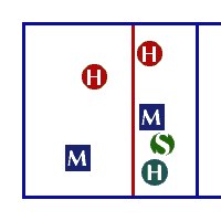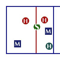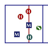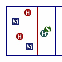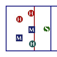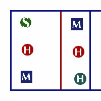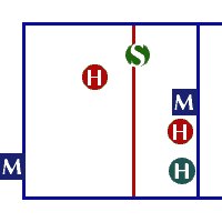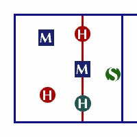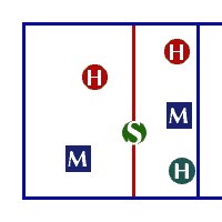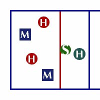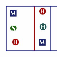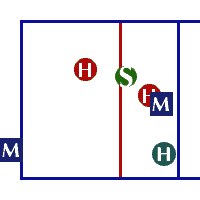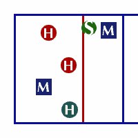 Расстановка "P6" (связка в зоне 6) Прием Связующий выходит на первую линию, при этом перед ним у сетки находится диагональный. После выполнения подачи соперником связующий меняется с ним местами. Данный порядок весьма спорен, диагональный (H) обычно нападает из зоны 2, а центральный блокирующий в 3-ей. И главное тут неудобство в том, что игроку, который находится в зоне 2 (игрок первого темпа M) должен поменяться местами с диагональным.