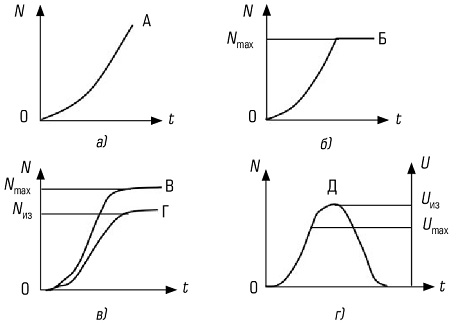 Рис. 6.2. Кривые роста популяции: А — экспоненциальная; 5 — экспоненциальная с прекращением роста; В — логистическая; Г — логистическая с изъятием особей без превышения квоты; Д — с превышением квоты. N — численность популяции (Nmах — максимальная); (Uиз- реальная скорость изъятия, Umax — критическая для популяции скорость изъятия продукции; t — время Удельная скорость изъятия — число изъятых особей в единицу времен, отнесенных к численности популяции. Если же человек изымает биопродукцию из популяции с постоянной (интегральной, но не удельной) скоростью, то возникает понятие квоты. Следовательно квота представляет собой скорость отлова. Когда квота не превышает установленной критической величины, то равновесие популяции сохраняется. В этом случае отлов можно вести сколь угодно долго без губительных последствий для популяции. S-образная кривая называется логистической кривой роста, поскольку она получена путем интегрирования уравнения, основанного на логически обоснованных допущениях. Если квота превышает критическую величину отлова, то происходит полный отлов популяции за конечное время: популяция не успевает самовосстановиться и гибнет (рис. 6.2г). Весьма интересны для ученых-экологов циклические популяции, подверженные закономерным колебаниям численности. Однако единой теории удовлетворительно объясняющей закономерности в циклических популяциях пока нет. Поддержание определенной плотности получило название гомеостаза популяций. В основе способностей популяций к гомеостазу лежат изменения физиологических особенностей, роста, поведения каждой особи в ответ на увеличение или уменьшение числа членов популяции, к которой она принадлежит. Механизмы популяционного гомеостаза зависят от экологической специфики вида, его подвижности, степени воздействия хищников и паразитов и др. У одних видов они могут проявляться в жесткой форме, приводя к гибели избытка особей, у других — в смягченной, например, в понижении плодовитости на основе условных рефлексов. У растений, ввиду особенностей их роста, регуляция плотности популяции происходит обычно не только путем изменения численности особей на единице площади, но и путем изменения их вегетативных возможностей. У животных жесткие формы регуляции плотности популяций проявляются обычно лишь в тех случаях, когда запасы пищи, воды или других ресурсов резко ограничены, а животные либо не способны в данный период к поискам ресурсов на другой территории, либо эти поиски неэффективны. Среди механизмов, задерживающих рост популяций, у многих видов большую роль играют химические взаимодействия особей. Другой механизм ограничения численности популяций — такие изменения физиологии и поведения при увеличении плотности, которые, в конечном счете, приводят к проявлению инстинктов массовой миграции. Наиболее эффективным механизмом сдерживания роста численности популяции на данном ареале является определенная система инстинктов — мечение и охрана участков, не допускающие размножения на них «чужих» особей. Генетические процессы в популяциях. В настоящее время известно, что все природные популяции гетерогенны и насыщены мутациями. Генетическая гетерогенность любой популяции при отсутствии давления внешних факторов должна быть неизменной, находиться в определенном равнове