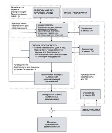 На рисунке показана связь между оценкой безопасности, независимой проверкой, анализом безопасности и другими видами деятельности, осуществляемыми в ходе проектирования атомной электростанции. Этот рисунок иллюстрирует также то, как Руководство по безопасности соотносится с другими публикациями МАГАТЭ, касающимися процесса проектирования. В ходе проектирования оценка безопасности и независимая проверка выполняются различными группами или организациями. Однако оба эти вида деятельности являются частями единого итеративного процесса, и оба имеют главной целью обеспечение выполнения требований по безопасности. По этой причине они рассмотрены в одном и том же Руководстве по безопасности. В некоторых случаях регулирующий орган также привлекается на стадии проектирования. Независимая проверка более эффективна, если она выполняется параллельно с проектированием и оценкой безопасности, поскольку более раннее обсуждение и прояснение проблем безопасности ускоряет и облегчает их решение. Рекомендации по улучшению проекта или оценки безопасности наиболее легко учитываются, когда проектная работа находится еще в стадии выполнения. С другой стороны, слишком тесные взаимоотношения поставят под вопрос независимость проверки, поэтому следует соблюдать баланс между эффективностью и независимостью. Основные проектные решения, принимаемые в ходе проектирования, могут потребовать от эксплуатирующей организации проведения специальной независимой проектной экспертизы, предмет которой ограничен областью рассматриваемых решений, а критерием служат относящиеся к предмету требования по безопасности. Проектные работы следует выполнять в соответствии с программой ОК, включающей независимую проверку всех проектных документов. В целом процесс ОК рассмотрен в Руководстве по безопасности SG-Q-10