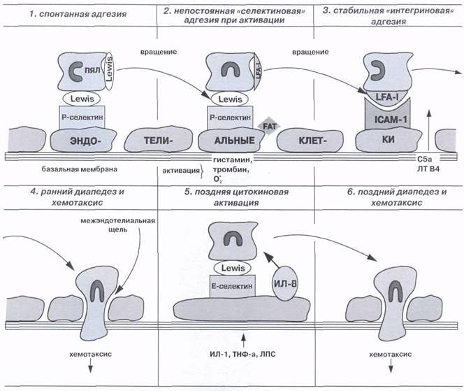 · Адгезия лейкоцитов к эндотелию обусловлена типом эндотелиальной выстилки и реализуется в посткапиллярных венулах (эндотелиоциты II типа). Она включает две последовательные стадии: 1) установление слабой непостоянной адгезии; 2) прочное стабильное связывание. · Слабая непостоянная адгезия обеспечивается участием селектинов, взаимодействующих с олигосахаридными лигандами на поверхности лейкоцитов (Lewis). Экспрессия селектинов усиливается при активации эндотелия гистамином, активными формами кислорода или цитокинами (ФНОα; ИЛ-1β). · Стабильная адгезия происходит при участии других молекул: со стороны лейкоцитов β1 (VLA) и β2 (LFA, MAC-1) – интегринов; со стороны эндотелия – иммуноглобулинподобных молекул адгезии (VCAM-1; ICAM-1; РЕСАМ). · Процесс стабильной адгезии лейкоцитов обусловливает не только их прочную фиксацию к эндотелию, но и приобретение ими способности к движению (локомоции). Связывание с лигандом интегринового рецептора (установление фокальных контактов – FAK) индуцирует конформационные изменения его внутриклеточного домена, активацию связанной с ним протеинкиназы (PK FAK) и последовательное фосфорилирование по тирозину ряда цитоплазматических белков. В конечном счете это приводит к изменениям цитоскелета с участием актиновых микрофиламентов (В.А. Черешнев с соавт., 2006). · Приобретение локомоторного фенотипа обеспечивает проникновение лейкоцитов в межэндотелиальные промежутки, чему способствует ретракция эндотелиоцитов. Последняя стимулируется продуктами (ФАТ, серотонин, тромбоксан) агрегированных и «прилипших» к эндотелию тромбоцитов. · Дальнейшему продвижению лейкоцитов вглубь эндотелия и пенетрации ими сосудистой стенки способствует их протеолитическая активность. Фактически нейтрофил «проедает» свой путь через базальную мембрану. · В целом, прохождение лейкоцитов через клеточную стенку происходит достаточно быстро. Так, если их внутрисосудистое перемещение, включая краевое стояние, занимает несколько часов, то диапедез через стенку сосуда – 30-60 минут. · Наряду с ранней активацией адгезивных процессов существует феномен т.н. поздней цитокиновой активации, поддерживающей адгезию, диапедез и хемотаксис лейкоцитов после первых 4-6 часов. В ней принимают участие как ранние цитокины (цитокины тревоги - ИЛ-1, ФНОα), так и более поздние цитокины, в частности ИЛ-8, продуцируемый моноцитами и клетками эндотелия, а также моноцит-хемотаксический протеин (МХП-1). Одним из главных участников цитокиновой адгезии поздней активации является ФНОα. С помощью указанных механизмов пролонгируется выход лейкоцитов в очаг повреждения и формирования в нем лейкоцитарного инфильтрата. · Движение лейкоцитов сопряжено не только с микрофиламентной реакцией и экспрессией молекул адгезии, но и с дегрануляцией клеток. Последняя необходима как для усиления адгезивных контактов клеток с матриксом (выделение в область псевдоподий внутриклеточного запаса адгезивных молекул из специфических и третичных гранул), так и для ослабления таких контактов (разрушение адгезивных молекул и их лигандов во внеклеточном матриксе секретируемыми гидролазами и металлопротеиназами). · Успешная локомоция лейкоцитов зависит и от биохимических особенностей матрикса, который варьирует в различных органах: в легких он богат коллагеном, ламинином и элас