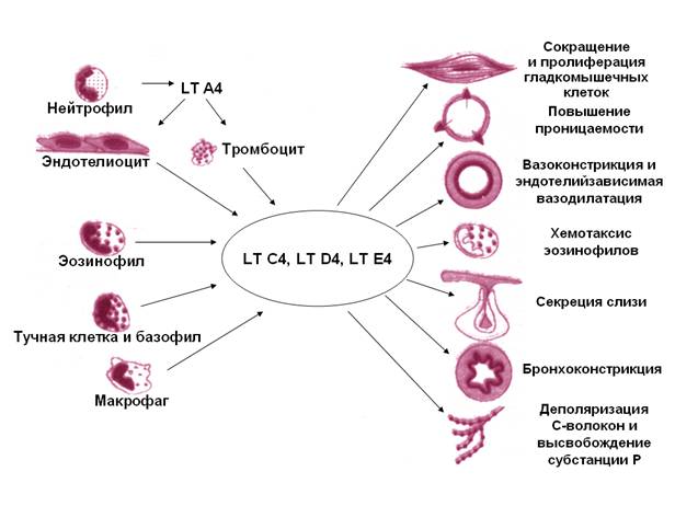 Рис.1. Клетки-продуценты лейкотриенов и их эффекты.