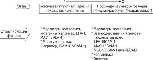 Рис. 10. —Этапы стадии краевого стояния лейкоцитов и факторы, стимулирующие краевое стояние (по П.Ф. Литвицкому, 2002) В стадии адгезии и выхода лейкоцитов выделяют 2 этапа: устойчивой («плотной») адгезии (1) и прохождения лейкоцитов через стенку микрососуда (2).