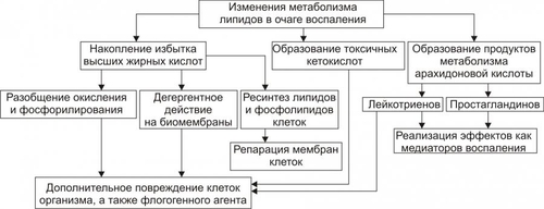В очаге воспаления метаболизм углеводов претерпевает характерные изменения, выражающиеся в преобладании гликолиза и развитии ацидоза. Причины • Повреждения мембранного аппарата и митохондриальных ферментов, возникающие под действием как флогогенного агента, так и других факторов, активирующихся или образующихся в ходе воспалительной реакции вторично. К этим последним относятся свободные радикалы и перекисные соединения, вещества с детергентным действием (ВЖК, гидроперекиси липидов), гидролазы лизосом, избыток Н+ и других агентов. • Избыток Ca2+, оказывающий (наряду с жирными кислотами) существенное разобщающее действие на окислительное фосфорилирование. • Увеличение в клетках уровня АДФ, АМФ и неорганического фосфата. Это активирует ключевые (лимитирующие) ферменты гликогенолиза и гликолиза. В связи с этим в очаге воспаления начинает возрастать удельный вес гликолитического ресинтеза АТФ. Проявления • увеличение поглощения тканью кислорода при одновременном снижении эффективности окисления глюкозы в процессе тканевого дыхания; • активация гликогенолиза и гликолиза; • уменьшение уровня АТФ в ткани; • накопление избытка лактата и пирувата. Последствия • Образующаяся при гликолизе АТФ, хотя и в недостаточной мере, но тем не менее может обеспечить поддержание энергозависимых процессов в клетках, особенно транспорта ионов и сокращения мышц, сохранение жизнеспособности и жизнедеятельности гистологических элементов в очаге воспаления. • Активация гликолиза сопровождается накоплением в клетках и во внеклеточной жидкости избытка промежуточных продуктов этого процесса, в том числе — пировиноградной, молочной и других кислот, что ведёт к формированию метаболического ацидоза. • На начальном этапе воспаления (когда многие митохондрии сохраняют свою структуру, а их ферменты — кинетическую активность) возобновление нормальной или близкой к ней оксигенации тканей сопровождается быстрым восстановлением эффективности тканевого дыхания, снижением интенсивности гликолиза и нормализацией энергетического обеспечения клеточных процессов. ЛИПИДЫ Обмен липидов в очаге воспаления характеризуется доминированием липолиза над реакциями их синтеза. Причины • Прямое повреждающее влияние флогогенного агента может привести к ферментативной и неферментативной деструкции мембранных фосфолипидов, ЛП, гликолипидов и других липидсодержащих соединений с высвобождением из них ВЖК, свободных липидов и образованием кетокислот. • Основной механизм липолиза в очаге воспаления — интенсификация гидролиза липидов и их комплексов с другими веществами в результате повышенного высвобождения липаз и фосфолипаз из повреждённых клеток, а также из лейкоцитов, в большом количестве накапливающихся в очаге воспаления. Помимо увеличения содержания липаз и фосфолипаз, в очаге воспаления отмечается значительное повышение их активности. Последнее связано с тем, что оптимум каталитической активности большинства липаз и фосфолипаз наблюдается в кислой среде. А в очаге воспаления, как известно, быстро развивается метаболический ацидоз. • Активация деструкции липидов за счёт интенсификации реакций свободнорадикального перекисного окисления липидов. В очаге воспаления усиление липопероксидных процессов связано со снижением акт