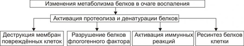 Рис. 5–4. Изменения метаболизма липидов в очаге воспаления. • Активация лизосомальных, а также мембраносвязанных липаз и фосфолипаз приводит к отщеплению от липидов ВЖК и их накоплению. Последние оказывают в очаге воспаления существенный разобщающий эффект и снижают эффективность тканевого дыхания в митохондриях. • Детергентное (разрушающее) действие ВЖК на клеточные мембраны сопровождается образованием сквозных каналов в мембранах и нерегулируемым транспортом по ним ионов, молекул органических и неорганических соединений, как в клетку, так и из неё, что завершается, как правило, гибелью клетки. • Накопление избытка токсичных кетокислот (ацетоуксусной, • Повреждение вышеуказанными факторами не только клеток организма, но и самого флогогенного агента, если в его состав входят липиды. • Использование ВЖК для синтеза фосфолипидов мембран и ресинтеза цитоплазматических липидов. ВЖК при этом остаётся одним из основных энергоёмких субстратов биологического окисления. • В ходе метаболизма арахидоновой кислоты образуются Пг и лейкотриены, обладающие многими регуляторными эффектами. БЕЛКИ Обмен белков характеризуется преобладанием протеолиза над процессами протеосинтеза. Главные причины • Прямое патогенное действие флогогенного агента, в том числе ферментативный протеолиз. • Массированное выделение из повреждённых паренхиматозных и стромальных клеток, а также из лейкоцитов протеолитических ферментов. Их активность значительна, так как каталитический оптимум большинства протеаз находится в кислом диапазоне рН (в очаге воспаления — метаболический ацидоз). • Активация свободнорадикальных и перекисных реакций, сопровождающихся деструкцией ЛП и высвобождением из них белковых соединений, которые разрушаются и/или денатурируются. Проявления • Активация процессов протеолиза и накопление продуктов протеолиза. • Торможение реакций протеосинтеза. • Денатурация молекул белка (образование аутоантигенов). Последствия В очаге воспаления вследствие интенсификации реакций протеолиза и денатурации белков развиваются следующие процессы (рис. 5–5).