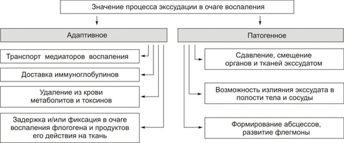 В очаге воспаления значение процесса экссудации имеют двоякое биологическое значение: адаптивное и патогенное (рис. 5–17).
