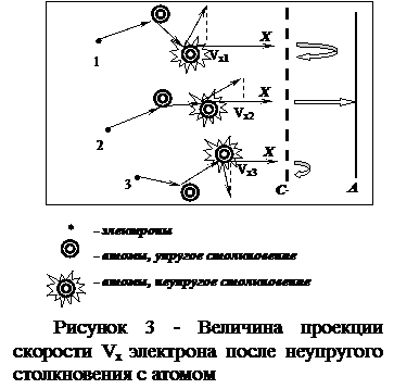 Несколько причин приводят к тому, что провалы экспериментальной зависимости I (U) не являются идеально резкими, и происходит некоторый сдвиг максимумов на кривой в сторону меньших энергий: 1 Существенный разброс энергии электронов из-за наличия области пространственного заряда в прикатодной области и высокой температуры термоэмиссионного катода (для данного случая справедлива максвелловская функция распределение частиц по скоростям и энергиям); 2 Падение напряжения на катоде прямого накала при протекании по нему тока накала, приводящее к различным значениям потенциала для разных точек катода; 3 Зависимость сечения возбуждения атомов ртути либо инертного газа от энергии электрона; 4 Разброс продольной составляющей скорости электронов после неупругого столкновения, величина которой определяет возможность преодоления задерживающего поля анод-сетка (рисунок 3).