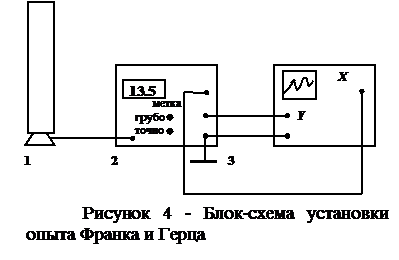 Чтобы избежать погрешности, обусловленной наличием контактной разности потенциалов U конт, при определении потенциала возбуждения следует рассматривать разность потенциалов между двумя максимумами вольт-амперной характеристики. Эксперимент Франка-Герца можно сделать более наглядным, если применить осциллографический метод снятия вольт-амперной характеристики (рисунок 4). В этом случае на участок сетка-катод триода 1 от блока управления 2 подаётся пилообразное напряжение некоторой частоты. Это же напряжение подается на вход