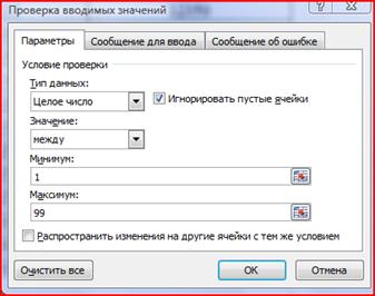Организуем контроль ввода данных (выделим нужные ячейки, выполним команду Проверка).
