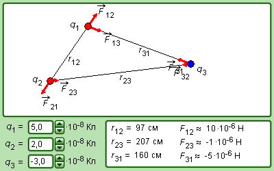 Опыт показывает, что силы кулоновского взаимодействия подчиняются принципу суперпозиции. Если заряженное тело взаимодействует одновременно с несколькими заряженными телами, то результирующая сила, действующая на данное тело, равна векторной сумме сил, действующих на это тело со стороны всех других заряженных тел. Рис. 1.1.4 поясняет принцип суперпозиции на примере электростатического взаимодействия трех заряженных тел.