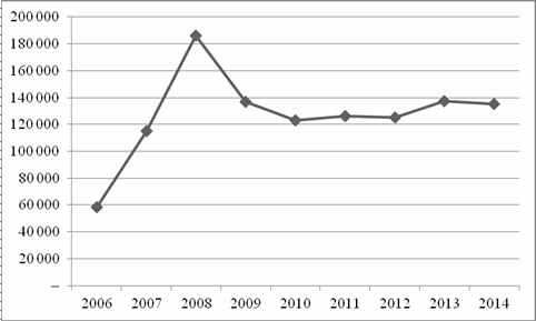 Рис. 1. Динаміка кредитів за період 2006-2014 рр,млн.грн