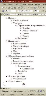 Программное обеспечение В каком‑то смысле разнообразие программного обеспечения представляет из себя просто‑таки неизведанную черную дыру, в которой найти хорошие инструменты для «управления проектами» не так‑то просто. В большинстве своем, приложения, разработанные специально для организации проектов, слишком навороченные, слишком сложные для того, чтобы адекватно функционировать с 98 процентами типичного контента. Они предназначены для очень маленького процента делового мира. Остальные же используют упрощенные версии подобных программ, потому как они менее формализованы и имеют более дружественный интерфейс. Я заметил, что не существует двух проектов, требующих одинаковой степени детализации и структуризации. Поэтому‑то очень сложно создать такое приложение, которое подходило бы всем. Наброски в электронном виде. Большая часть того, что человек хочет структурировать в своем мышлении относительно проекта, можно найти в любом приложении, имеющем простую функцию построения иерархии. Раньше я использовал программу Grandview, а сейчас использую Microsoft Word для такого рода планирования. Вот кусок наброска, который я сделал, когда планировал в последний раз: