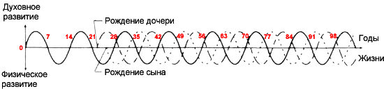 Жизнь представляет собой волнообразное движение по спирали. Виток спирали - это отведенный человеку срок, который начинается и завершается в одном месте, с той разницей, что конец всегда расположен выше, чем начало. Это означает, что независимо от хода жизни, человеческий дух с каждой жизнью становится мудрее. Постоянное чередование хорошего и плохого придает жизни волнообразное движение в виде синусоиды на этой спирали. Человек в своей целостности состоит из духовного и физического тела. В космическом плане человеку свойственно число 7. В теле насчитывается семь чакр. Мы живем и становимся старше. Вчерашний день никогда не бывает похожим на завтрашний, ибо жизнь изменяется. Независимо от нашего пола, спады и подъемы нашей жизненной синусоиды чередуются через каждые семь лет. Женщина и мужчина являются противоположностями, образующими единое целое, поэтому у ровесников - мальчиков и девочек, юношей и девушек, мужчин и женщин - разные интересы и свои особенности развития. Посмотрите на схему, и Вы увидите, что если девчушка в возрасте 3,5 лет очень открыта духовно и ее считают умнее мальчиков, то из-за своего физического развития она не особенно беспокоится. А мальчик того же возраста своей неуемной активностью стремится утвердиться в силе. В стихах для него нет проку. В семилетнем возрасте происходит первое выравнивание, возникает интерес как к духовной, так и материальной сторонам жизни. Потому-то это - самый подходящий возраст для поступления в школу. Если девочка десяти с половиной лет начинает проявлять особый интерес к своему телу и его прихорашиванию, то мальчик того же возраста с презрением от нее отворачивается. В его мире столько всего интересного. Он с гораздо большей охотой сходит, например, в библиотеку. В четырнадцать лет у мальчика и девочки интересы и дела примерно одни и те же. В возрасте 17,5 лет девушка обнаруживает в себе тягу к познанию жизненной мудрости, тогда как ее ровесника больше интересуют техника и спорт. С 21 года они - нормальные молодые люди, которые при обоюдном согласии могут и пожениться. У женщины наступает период знакомства с материальными проблемами; она рожает детей, воспитывает их и требует, чтобы мужчина занимался тем же, но у мужчины в возрасте 21- 28 лет происходит процесс духовного развития. В семье неминуемо возникают разногласия. В 28 лет наступает возраст уравновешенной переоценки жизненных ценностей, начинается переломный этап. Теперь мужчина с головой уходит в работу, испытывая удовлетворение от своих способностей и возможностей. Он трудится и никак не может понять жену, которую тянет заниматься духовным самоусовершенствованием, культурно просвещаться, которая хочет чего-то легкого и эмоционального. Опять противоречия!