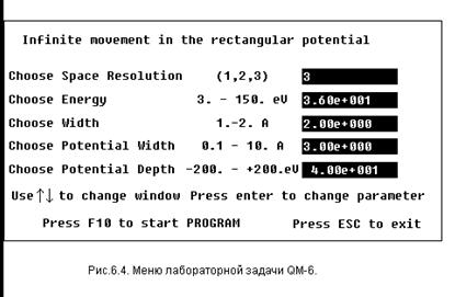 Программа Infinite movement in the rectangular potential богата по своим возможностям и предоставляет широкий выбор для экспериментирования. В меню лабораторной задачи (рис. 6.4) вы должны задать начальное состо- яние частицы (величины энергии E0 и начальной ширины волнового пакета x0), а также параметры потенциала. В программе используется потенциал