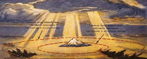 Результатом действия светового излучения может быть воспламенение и возгорание предметов, оплавление, обугливание, большие температурные напряжения в материалах. При воздействии светового излучения на человека возникает поражение глаз и ожоги открытых участков тела и временное ослепление, а также может возникнуть поражение и защищенных одеждой участков тела. Ожоги возникают от непосредственного воздействия светового излучения на открытые участки кожи (первичные ожоги), а также от горящей одежды, в очагах пожаров (вторичные ожоги). В зависимости от тяжести поражения ожоги делятся на четыре степени: первая — покраснение, припухлость и болезненность кожи; вторая — образование пузырей; третья — омертвление кожных покровов и тканей; четвертая — обугливание кожи. Ожоги глазного дна (при прямом взгляде на взрыв) возможны на расстояниях, превышающих радиусы зон ожогов кожи. Временное ослепление возникает обычно ночью и в сумерки и не зависит от направления взгляда в момент взрыва и будет носить массовый характер. Днем оно возникает лишь при взгляде на взрыв. Временное ослепление проходит быстро, не оставляет последствий, и медицинская помощь обычно не требуется.