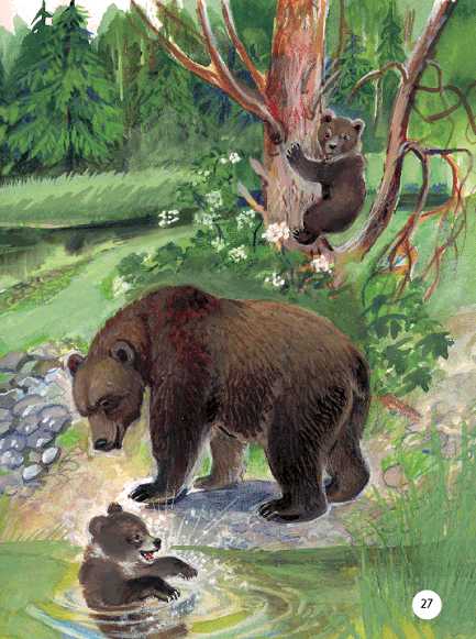Медвежата появляются на свет крохотными, величиной с варежку. Весной, с таянием снегов, медведица‑мать перестаёт кормить малышей молоком, поднимается из берлоги и отправляется с ними в лес. Она учит косолапых отыскивать на земле, под палыми листьями корешки трав и кедровые шишки. Медведица ведёт медвежат к реке на водопой, учит их плавать, купаться на отмели. Вдруг два медвежонка вздумали озорничать. Один залез на вершину старой сухой сосны и чуть‑чуть не свалился оттуда в реку. А другой стал что есть сил бить лапами по воде – брызги полетели во все стороны! Всю рыбу распугал.