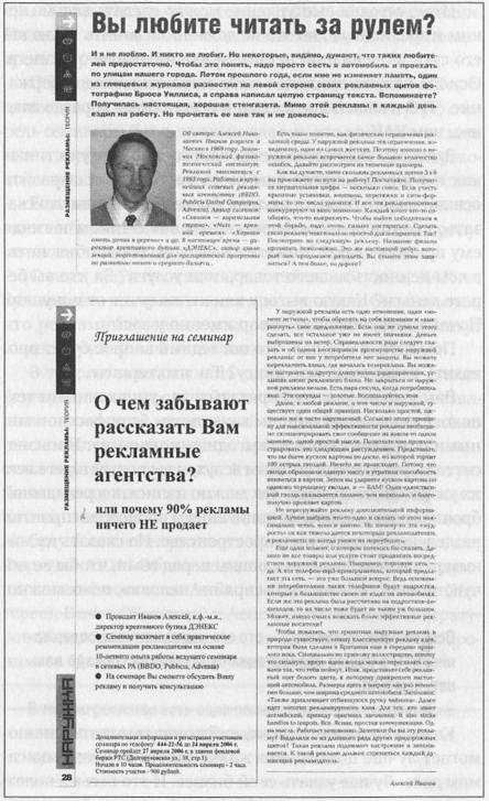 Можно поступить немного по‑другому. Например, в качестве аперитива, я публиковал толковую статью в профильном журнале, а самую вкусную информацию оставлял уже для семинара. И анонсировал его в размещенной рядом со статьей рекламе. Кстати, гонорар за статью послужил оплатой за размещение рекламы семинара в журнале. Так что это еще одна БЕСПЛАТНАЯ возможность, о которой не стоит забывать (рис. 10.2). Если вы не готовы раскрывать свои профессиональные секреты на страницах журналов и газет, то доклад на семинаре или конференции – отличное средство для нейтрализации этого недостатка открытой печати. Вы поделитесь вашими знаниями и умениями не со всеми‑всеми‑всеми, а с потенциальными клиентами, которые заинтересованы в этом настолько, что, возможно, даже заплатили за свое участие деньги. Это первое преимущество вашего выступления – его адресная направленность и невидимость для конкурентов. Но есть и ряд других. • Время контакта с целевой аудиторией – от 30 минут до двух часов. Аномально большой период для рекламы. Именно поэтому выступления на семинаре гораздо лучше, чем традиционные СМИ, подходят для продвижения сложных товаров и услуг. У вас в запасе достаточно времени и возможностей, чтобы убедить потенциальных клиентов в том, что с вами стоит иметь дело. Для сравнения: время контакта для наружной рекламы или прессы составляет… всего полторы‑две секунды. • Интерактивность. Вы всегда можете ответить на возникшие по ходу вашего выступления вопросы. А какие‑то темы осветить полнее, если почувствуете, что публика проявляет к ним больший интерес. • Мультимедийность. Вы можете включить в презентацию как видео‑, так и аудиоматериалы. Сегодня технические средства настолько многообразны, что можно воздействовать на все пять органов чувств человека одновременно. Вплоть до обоняния и вкуса. При этом не забывайте пригласить в союзники шестое – чувство юмора.