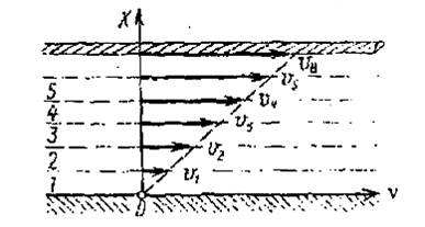 Рідина дотикається до обох пластин: товщина її шару Δx. Нижня пластина закріплена. Рідина в'язка і прилипає до обох пластин, тому шар рідини, який безпосередньо межує з пластиною, не рухається щодо неї. Прикладемо до верхньої пластини горизонтальну силу F, під дією якої пластинка буде рухатись зі швидкістю υ. Внаслідок "прилипання" найвищий шар також рухається зі швидкістю υ. Він впливає на сусідній шар, зумовлюючи його рух, але з дещо меншою швидкістю. Кожен шар передає рух з меншою швидкістю шару, що лежить під ним, і так аж до нерухомого нижнього шару. Якщо швидкість υ достатньо мала, то такий рух називають ламінарним, тобто окремі шари рідини не змішуються. Вивчаючи внутрішнє тертя, Ньютон встановив, що сила тертя між шарами рідини, які рухаються з різними швидкостями, залежить від площі дотику шарів і зміни швидкості при переході від одного шару до іншого (градієнт швидкості). Градієнт швидкості визначається відношенням зміни швидкості двох шарів до найкоротшої відстані між ними: