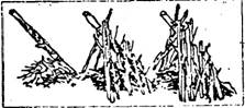 Шалаш. Самый обычный вид костра: под вбитую косо в землю ветку кладется рас палка, а сверху ветки -толстые клади в последнюю очередь.