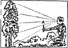 определяет расстояние до нужной точки. Примерно таким же способом можно определить и высоту дерева или другого предмета. Сделай на дереве пометку на высоте Твоего роста или поставь товарища у подножия дерева. Отойди подальше, чтобы Тебе была видна верхушка дерева. Возьми палочку и держи ее на расстоянии вытянутой руки, закрой один глаз и отметь на палочке ногтем или карандашом расстояние от земли до отметки на дереве. Потом подними палочку, чтобы верхняя
