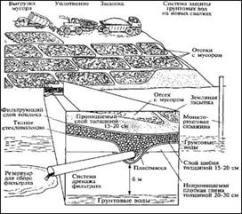 Безопасная эксплуатация полигона подразумевает следующие меры: · процедуры исключения опасных отходов и ведение записи по всем принимаемым отходам и точным координатам их захоронения; · обеспечение ежедневного покрытия сваливаемых отходов грунтом или специальной пеной для предотвращения разноса отходов; · борьбу с переносчиками болезней (крысами и т.д.) обычно обеспечивается использованием ядохимикатов; · на полигон должен осуществляться только контролируемый доступ людей и животных - периметр должен быть огорожен и охраняться; · гидротехнические сооружения должны минимизировать попадание дождевых стоков и поверхностных вод на полигон, а все поверхностные стоки с полигона должны направляться на очистку; жидкость, которая выделяется из отходов не должна попадать в подземные воды - для этого создаются специальные системы гидроизоляции; · эта жидкость должна собираться системой дренажных труб и очищаться перед попаданием в канализацию или природные водоемы; · регулярный мониторинг воздуха, грунтовых и поверхностных вод в окрестностях полигонах.