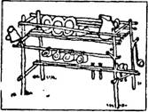 В разведческих лагерях и походах часто приходится подвешивать разные вещи: котелки над костром, мешки с едой - чтобы звери не достали и т. д. На рисунках показано, как можно смастерить из веток и тонкой веревки различные крючки. Мытье лагерной посуды. Для того чтобы облегчить мытье закопченных котлов, перед варкой натрите их внешние стенки