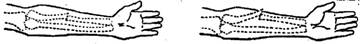 ВЫВИХ При настоящем вывихе кость выскакивает из сустава. Если есть опухоль и сильная боль, но движения возможны, то это растяжение связок. В этом случае надо наложить тугую повязку. Если растяжение в щиколотке—нужно делать несколько раз в день горячие ножные ванны. При настоящем вывихе не старайся вытягиванием конечности сам вправить ее. Сделай сустав неподвижным и зови врача (смотри иллюстрации ниже). ПЕРЕЛОМ Перелом может быть открытым (если кость совершенно сломана и торчит наружу) и закрытым. Последний может быть полным, если кость совершенно переломлена, и частичным, если она треснула.