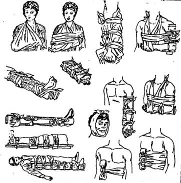 Признаки: сильная боль, невозможность двигать конечностью, неестественная подвижность при ощупывании. Переломы — серьезная вещь, и с ними нужно как можно скорее обращаться к врачу. Твоя задача, если есть рана—осторожно прочистить и перевязать, а место перелома и всю конечность сделать неподвижным. Как сделать сломанную конечность неподвижной Руку можно положить в перевязь, сделанную из платка. Однако этого недостаточно для полной неподвижности. Руку надо привязать к туловищу вторым платком. Доски, дощечки (в случае нужды—деревянные ложки, зонтики и т. п.) часто употребляются для фиксации поврежденной конечности. Больное место нужно перевязать и покрыть ватой. Если ваты нет, то оберни толстым слоем газетной бумаги.