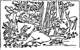 Ты нашел следы, по ним Ты представляешь себе жизнь леса. Но иди дальше, постарайся увидеть эту жизнь, подойти к животным, населяющим лес. Здесь начинается новая трудная страница лесной мудрости - подкрадывание. И начинается она совсем не так, как Ты думаешь - плюх на живот и пополз. Во-первых, научись ходить тихо, незаметно: не топать ногами, не махать руками, не задевать все предметы по пути. Упражняться начни дома. Завяжи другу глаза, а сам подойди к стулу, возьми его, отнеси к двери, открой ее и поставь стул в другой комнате. Вот если после этого Твой друг не сможет сказать, что Ты что-то переносил, открывал дверь - это уже хорошее начало. В поле, в лесу следи за собой, чтобы ноги ступали только на мягкую почву, а не на ветки и камни, пока это не войдет в привычку и Тебе уже не надо будет смотреть вниз по ходу. Во-вторых, научись окаменевать. Это значит, в движении останавливаться и сохранять свое положение не шелохнувшись. Можно начать тренироваться дома и в саду. Насыпь птицам корм на подоконник и сядь вблизи. Если будешь сидеть абсолютно неподвижно, птицы постепенно станут подлетать и клевать совсем близко от Тебя. Если пошевелишься - улетят. Попробуй, сколько Ты сможешь выдержать. Один любитель птиц достиг таким путем невероятного. Он одевался огородным чучелом и насыпал себе на шляпу и в трубку, которую держал во рту, зерно, и так замирал, что птицы клевали зерно, сидя на нем. И все же ни одна птица, заметившая, что это живой человек, а не чучело, больше не возвращалась. Надо сказать, что делал он это не в городе, а на опушке леса, так что имел дело не с дерзкой воробьиной братией, а с вольными птицами. В-третьих, научись терпеливо ждать. Бегать, высунув язык, в поисках зверей - бессмысленное дело. Надо выследить их тропинки и жилища и, затаившись, ждать, пока звери не появятся. А ждать приходится долго, иногда часами. Скучно? Настоящему разведчику, таежнику и охотнику не скучно. За настоящую радость общения с природой надо платить временем и силами. Кроме того, Ты должен быть одет в одежду защитного цвета. Наша скаутская форма обычно идеально подходит для этих целей, но галстук, конечно, надо спрятать.