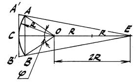 Задача 1. Спрямить дугу АВ окружности с известным центром О (рис. 7). 1. Соединим концы дуги и, тем самым, получим хорду АВ. 2. Через центр О дуги проведём прямую, перпендикулярную хорде. 3. На этой прямой от т. О отложим вправо отрезок ОЕ=2R и полученную т. Е,соединим с концами дуги А и В. 4. Через т. С проведём к дуге касательную, параллельную АВ; на ней продолженияпрямых ЕА и ЕВ отсекут отрезок А' В',который с достаточным приближением и будет равендлине дуги АВ. Этот способ даёт минимальные погрешности при угле дуги φ<40○. Его в15 в. предложилкардинал Николай Кузанский(NicolausCusanus).