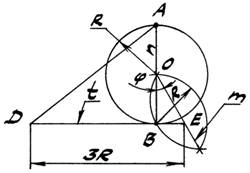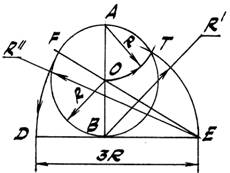 Задача 2. Спрямить полуокружность АВ (рис. 8). 1. Проведём в т. В касательную t к окружности и из центра О к диаметру АВ проведём прямую m под углом φ=30○. 2. В пересечении прямых t и m находим т. Е. 3. От т. Е на касательной откладываем отрезок ЕD=3R, который приближенно равендлине полуокружности АВ. На рис. 9 аналогичная задача решена несколько иначе. Предлагается разобрать её самостоятельно, анализируя несложный чертёж.