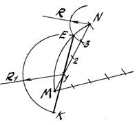 Задача 3. Определить длину дуги МN, если центр её неизвестен (рис. 10). 1. Делим хорду МN на четыре равные части. 2. Одну четверть откладываем от т. N на дуге МN. 3. Найденную т. Е соединяем с точкой деления 1. 4. Удваивая отрезок Е1 до отрезка ЕК, получаем спрямлённую длину дуги МN.