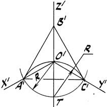 Задача 1. Построить прямоугольную изометрию окружности k радиуса R, расположенной в горизонтальной плоскости π'2 (рис. 40 a,b). 1. Строим окружность с центром в т. О', через которую проводим аксонометрические оси x', y ' и z' (рис. 40 a).