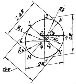 На рис. 43 для построения прямоугольной диметрии окружности того же радиуса R, лежащей во фронтальной плоскости π'1, через концы 1, 2, 3 и 4 (точки стыка) сопряжённых диаметров, параллельных осям х' и z' проводим горизонтальные прямые, которые пересекают взаимно-перпендикулярные оси МN и LК овала в четырёх центрах – О1, О2, О3 и О4. Окончательное проведение четырёхцентровой кривой несложно уяснить из чертежа. Следует иметь в виду, что ось LК овала в плоскости π'2 параллельна диметрической оси y' и равна 1,9R, другая ось MN равна 2,12R. Обе величины с достаточным приближением соответствуют осям эллипса, лежащего в плоскости π'1.