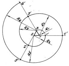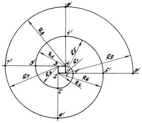 2. Из центра 2 проводим полуокружность 1'-2' радиуса R2. 3. Из центра 1 проводим полуокружность 2'-1' радиуса R3. Дальнейшие построения аналогичны и их легко понять из чертежа.