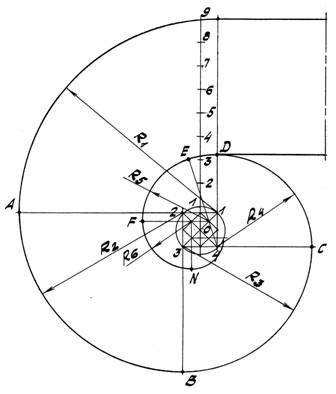 3. Соединяем середины сторон полученного квадрата и, таким образом, находим ещё один квадрат, вписанный в предыдущий, в который, в свою очередь, аналогичным образом вписываем очередной квадрат 5 - 6 - 7 - 8 (обход вершин также противчасовой стрелки) и т.д. (рис. 50 b). 4. Строим дугу 9-А радиуса R1= 1 - 9 из центра 1; т. А лежит на продолжении стороны квадрата 1 - 2. 5. Строим дугу АВ радиуса R2=2 - А, причем т. В лежит на продолжении стороны 2-3 квадрата. Далеепостроения ведутся аналогичным образом. Точку Е стыка двух смежных дуг радиусов R4 и R5 находим на продолжении отрезка 4 - 5.