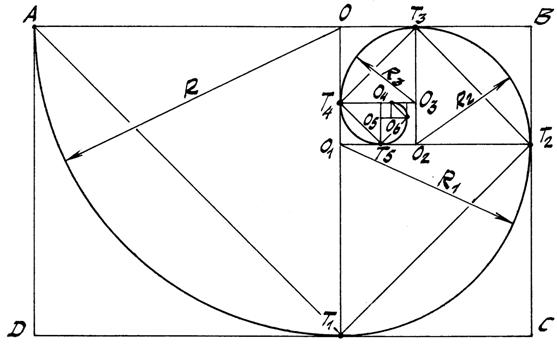 Спираль можно строить также на основе золотого прямоугольника (рис. 51), в котором отношение большей стороны к меньшей равно золотой пропорции, т.е. АВ / ВС = 1+ В этом прямоугольнике его стороны АВ и DC делятся точками О и Т1 в отношении 5 / 3. В результате прямоугольник оказывается разделённым на квадрат АОТ1D и прямоугольник ОВСТ1 стороны ОТ1 и ВС которого, в свою очередь, так же делятся вотношении 5 / 3. Очередной и последующие прямоугольники продолжают делить аналогичным образом.