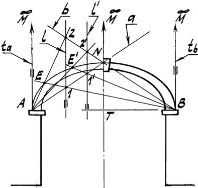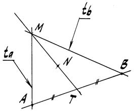 Задача2. Построить арочную кривую, которая определена парой взаимно-параллельных касательных ta и tb с точками касания А и В на них и точкой N подъёма (рис. 54). Поскольку дискриминант f= N 1. Проводим прямые a =А 2. Между А и В проводим произвольно прямую l ║ ТN, которая пересечёт прямые a и b соответственно в точках 1 и 2.