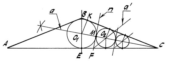 1. Из вершины В опускаем перпендикуляр на сторону АС и находим его основание – точку Е 2. Строим биссектрису угла ВСА и отмечаем точку О1 её пересечения с прямой ВЕ. 3. Проводим первую касательную окружность из т. О1 с радиусом О1Е= О1К. 4. Через т. М проводим касательную n к вписанной окружности (n ^ a). 5. Строим биссектрису а' угла, заключённого между прямыми n и АС. 6. В пересечении прямых а и а' находим центр О2 второй касательной окружности. Дальнейшие построения производятся аналогично.