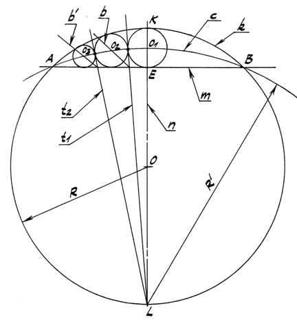 Задача 5. Вписать в область, отсечённую от круга k прямой m не менее семи касательных окружностей (рис. 61). 1. Строим прямую n (n É О), перпендикулярную прямой m и в их пересечении отмечаем т. Е. 2. Делим отрезок ЕК пополам и находим, тем самым, центр О1 первой касательной окружности. 3. Проводим касательную t1 (t1 É L) к первой окружности. 4. Проводим биссектрису b угла, заключённого между прямыми m и t1. 5. На пересечении прямой b и дуги радиуса R' =LB находим центр О2 второй касательной окружности. Центры последующих касательных окружностей находим аналогичным образом.
