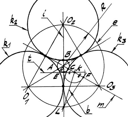 Задача 6. Описать около данной окружности k три равные касательные окружности (рис. 62). 1. Делим данную окружность на три равные части точками А, В и С, через которые проводим радиальные прямые. 2. Через т. Е проводим касательную t к окружности, которая пересекается с радиальной прямой m (ОС) в т. К. 3. Строим биссектрису b угла, заключённого между прямыми t и m. 4. Находим т. L в пересечении биссектрисы b и вертикальной оси i É В. 5. Проводим окружность e радиуса OL и в её пересечении с радиальными прямыми, проходящими через тт. А, В и С находим центры О1, О2 и О3 искомых окружностей.