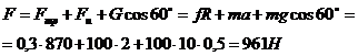 Тело массой 100 кг поднимается вверх по наклонной плоскости с ускорением 2м/с2. Коэффициент трения 0,3. Определить величину движущей силы.