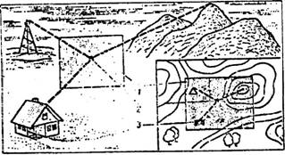 Ориентирование с картой, но без компаса отличается тем, что карту ориентируют по линиям местности, или по ориентирам. Ориентирование по линии местности применяется при совпадении маршрута с прямолинейным участком дороги, просеки, реки. В данном случае достаточно провизировать направление еще на один ориентир. Пересечение этого направления с изображением линии местности на карте и даст Твое местонахождение. Если вблизи от местонахождения удалось найти створ достаточно удаленных друг от друга и изображенных на карте местных предметов, то по линии створа и направлению еще на один ориентир (как в предыдущем случае) определяется Твоя точка стояния. При нахождении разведчика вблизи точечного ориентира следует найти этот ориентир на карте и по второму ориентиру направить верхний обрез карты на север. Если ориентиры находятся далеко, точку стояния определяют методом "обратной визирной засечки". Для этого, сориентировав карту, последовательно визируют и прочерчивают направление к двум ориентирам. Точка пересечения направлений будет точкой стояния. Для контроля обычно берут третье направление. Если Твой маршрут проходит на местности, слабо "читаемой по карте", то для ориентирования применяют способ Болотова. Для этого из одной точки на листке прозрачной бумаги последовательно визируют и прочерчивают направления на три видимых на местности и опознанных на карте ориентира. Затем накладывают прозрачную бумагу на карту так, чтобы прочерченные направления на ориентиры прошли через их изображение на карте. При таком положении листка точка на нем (и карте) будет точкой местонахождения разведчика. На практике же разведчики часто прибегают к приближенному ориентированию, определяя точку стояния по расстоянию ближайшего имеющегося на карте ориентира.